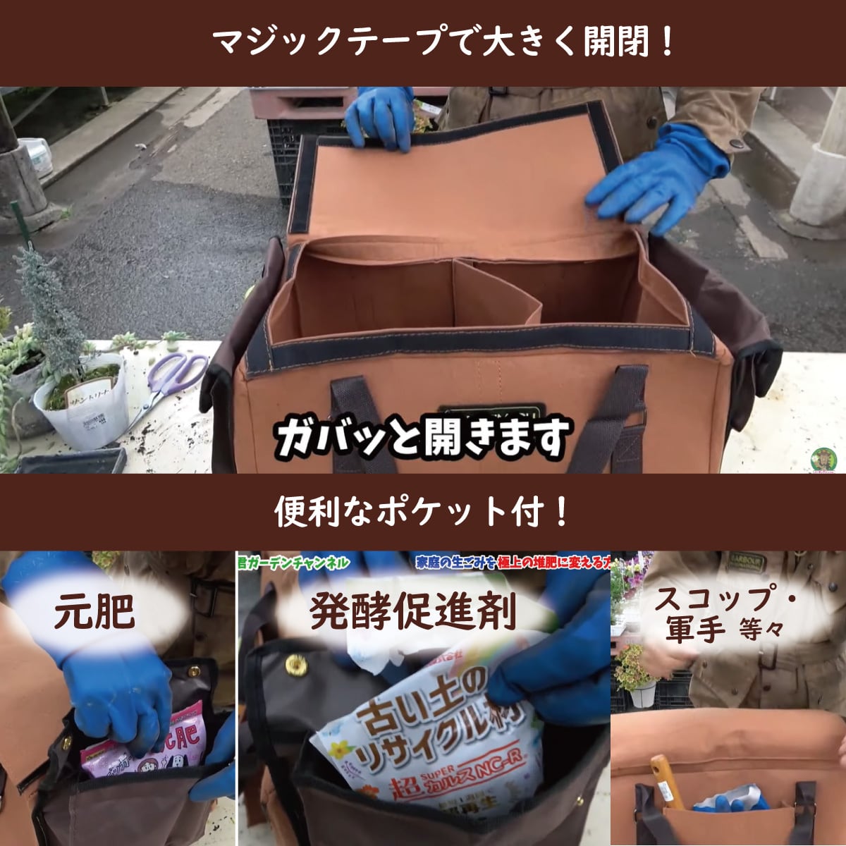 ●油かすや元肥、発酵促進剤が入る防水ポケット×2 スコップや手袋が入る不織布ポケット×1